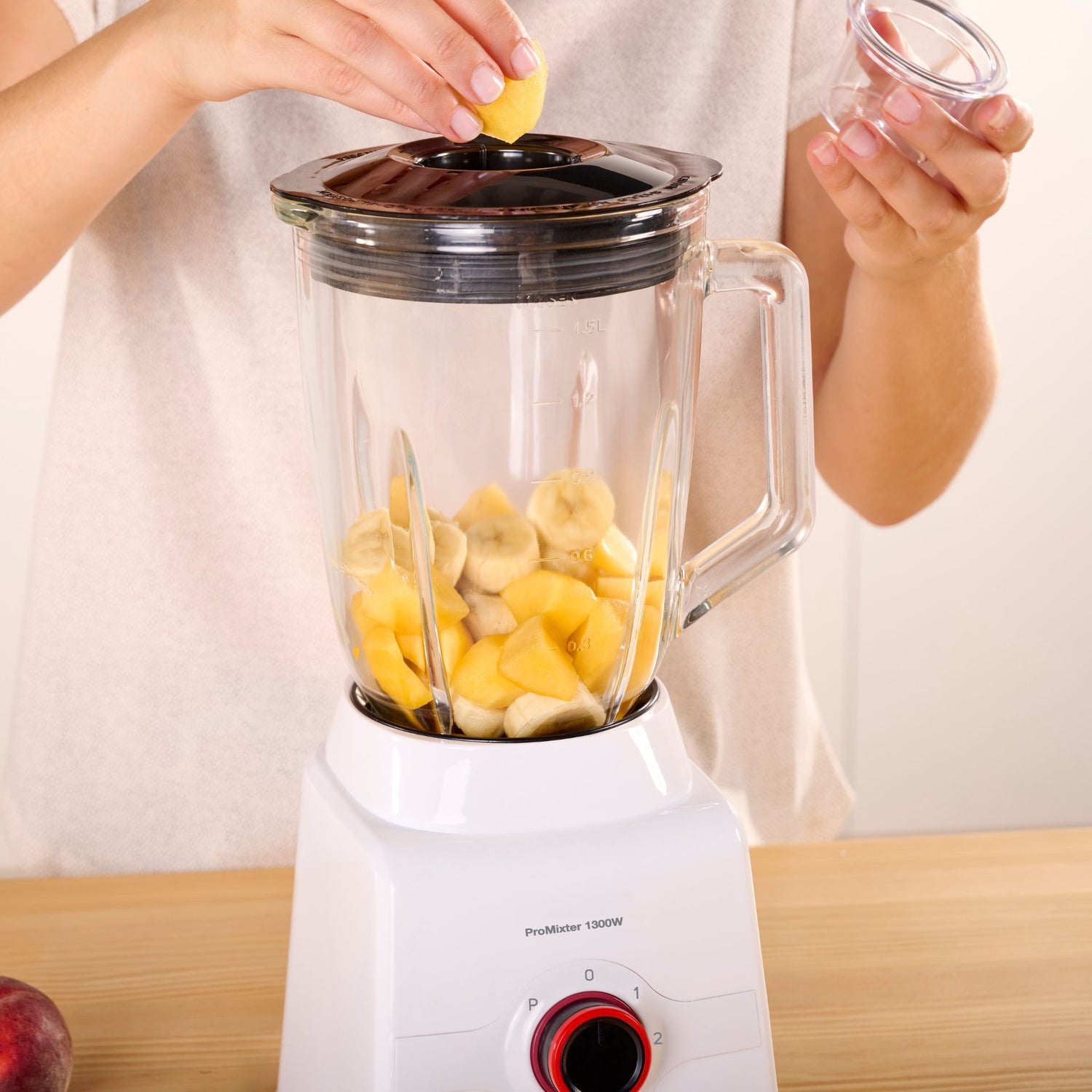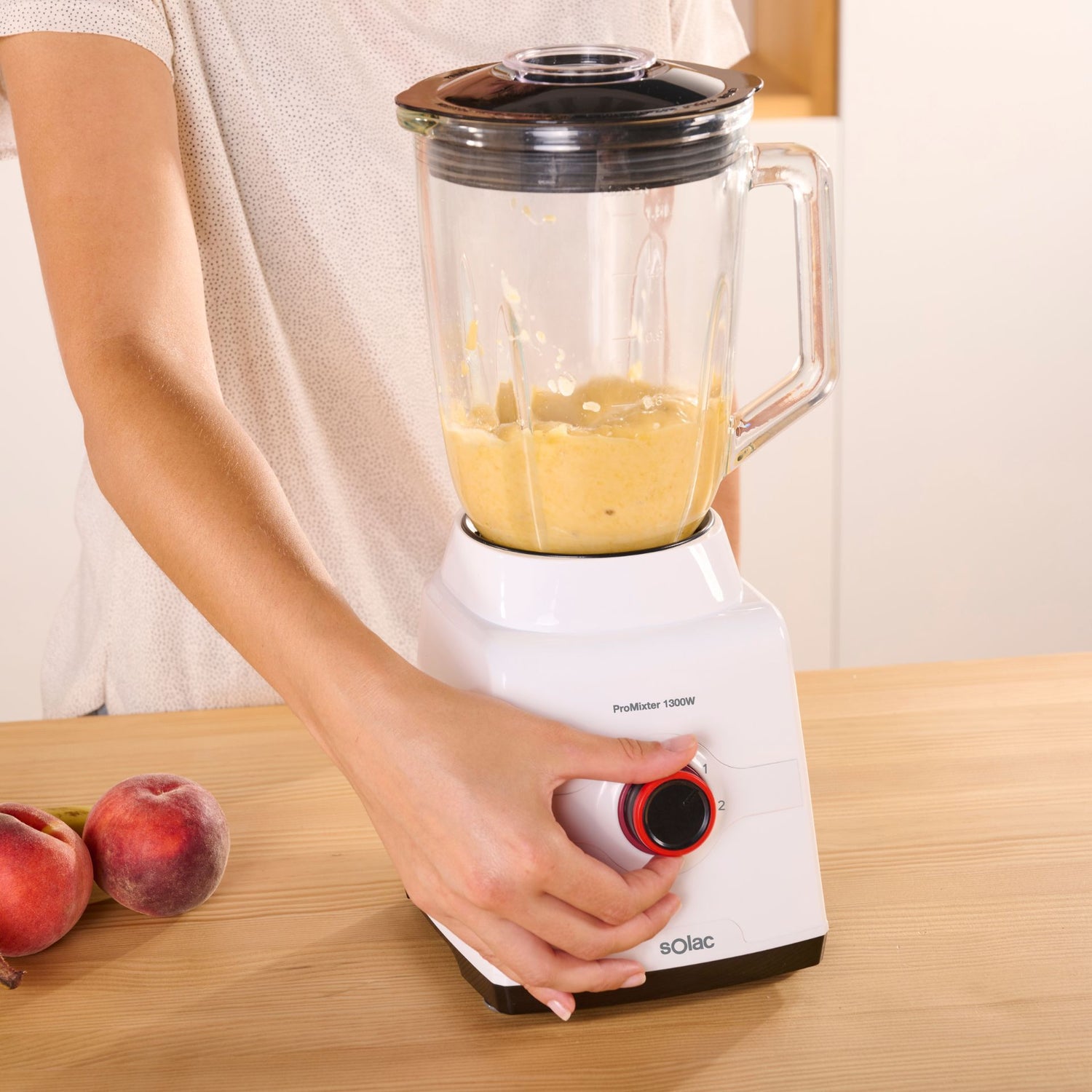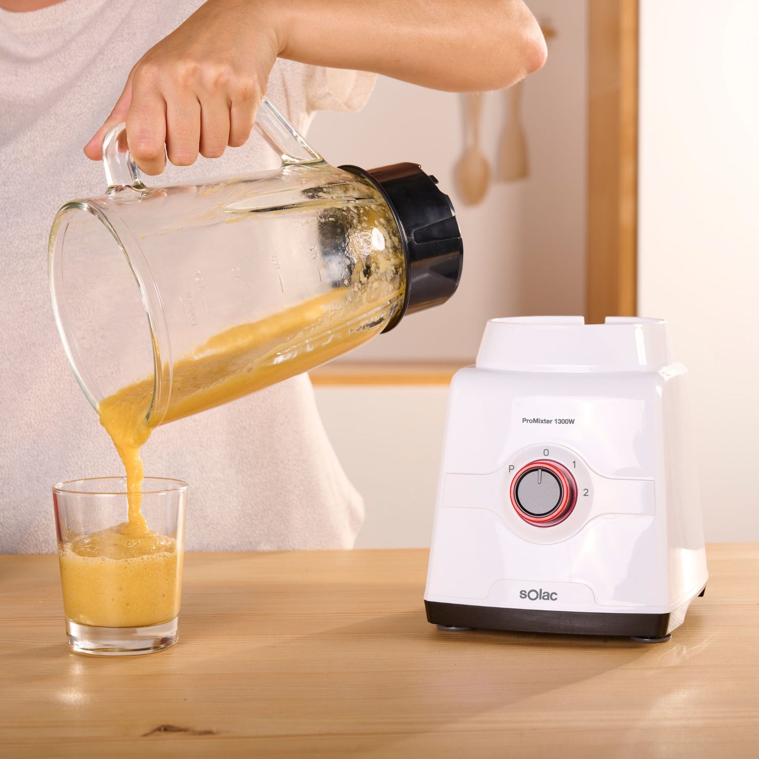 Elabora múltiples batidos, smoothies e incluso granizados con la batidora de vaso con 1300W de potencia de Solac. Pro Mixter 1300W ofrece una jarra graduada de cristal de 1,5L, cuchillas desmontables de 4 filos de acero inoxidable y 2 velocidades, más función Turbo capaz de picar hielo.