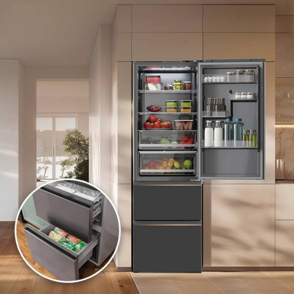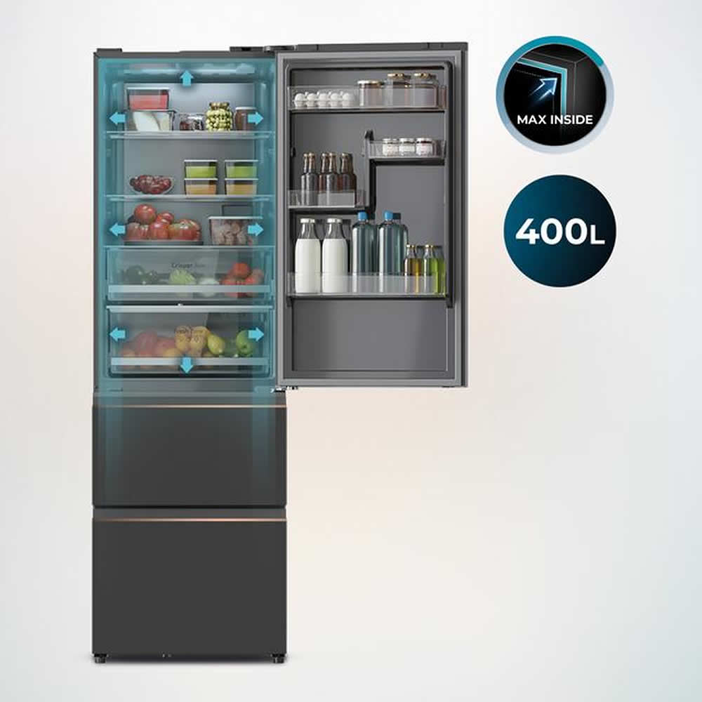 El frigorífico ofrece una capacidad de 400 L gracias al sistema Max Inside, que reduce el grosor de las paredes para maximizar el espacio interior. Además, su interior cuenta con un exclusivo color gris.