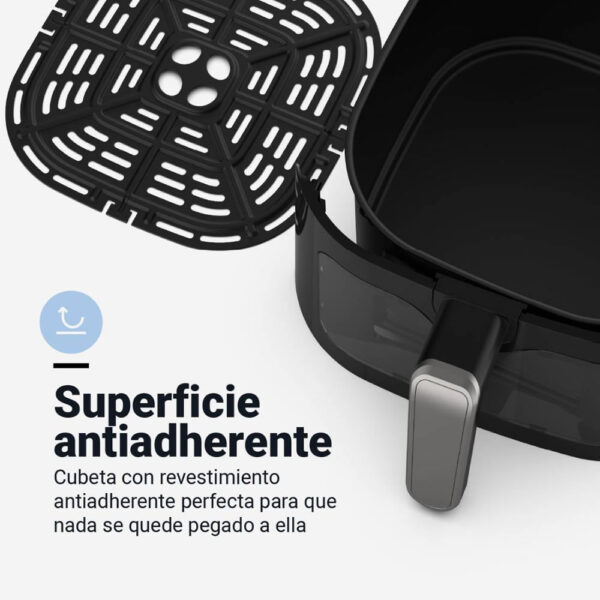 La freidora utiliza un sistema de circulación de aire de alta velocidad que cocina los alimentos de manera eficiente, logrando texturas crujientes exteriormente y jugosas por dentro. El control digital facilita el ajuste del tiempo y la temperatura para adaptarse a diferentes recetas.