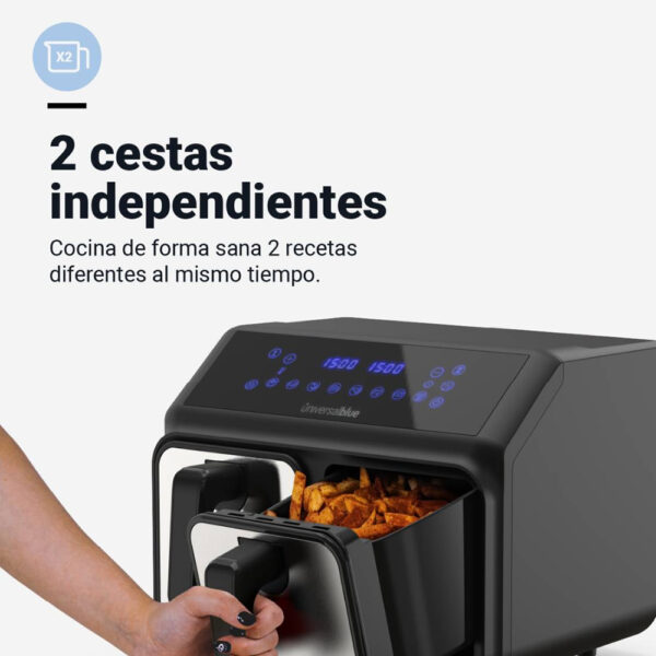 Esta freidora utiliza tecnología de circulación de aire caliente, logrando una cocción uniforme y resultados crujientes sin necesidad de añadir aceite. Su doble compartimento permite cocinar distintos alimentos al mismo tiempo, sin mezclar sabores.