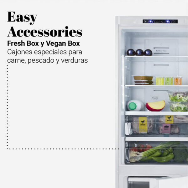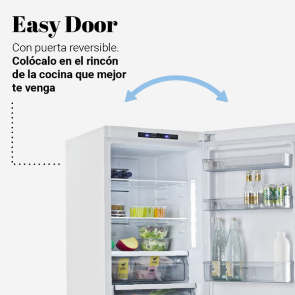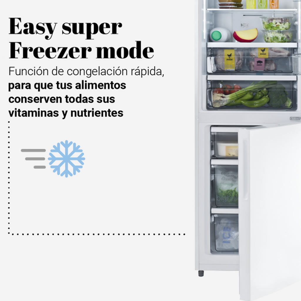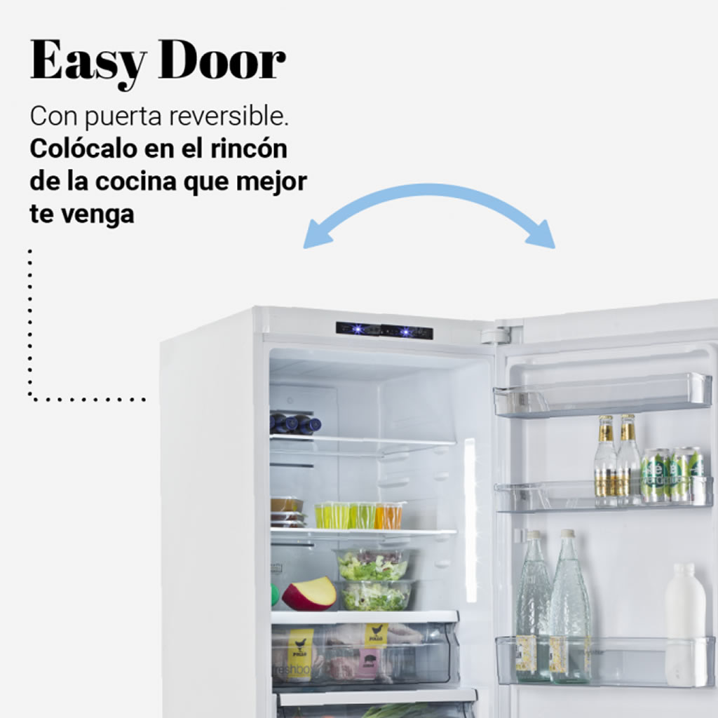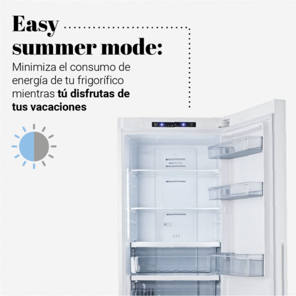 Su Sistema No Frost, te da la posibilidad de refrigerar o congelar tus alimentos mediante el reparto homogéneo de aire frío y sin escarcha. También, puedes controlar fácilmente la temperatura del frigorífico y congelador gracias a su control electrónico y seleccionar los modos Summer y Super Freezer, para que minimice el consumo de energía durante tus vacaciones o para que la temperatura del congelador se reduzca rápidamente y tus alimentos se congelen de forma rápida y eficaz sin perder las vitaminas y nutrientes.