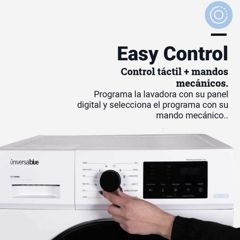 ¡Descubre todas sus prestaciones y disfruta de las tareas del hogar! IBIZA 4008W es la lavadora de carga frontal de 8 kg de UniversalBlue, que te permitirá cuidar y conservar tu ropa. Su actual diseño en color blanco con detalles en negro, aportará distinción a tu hogar.