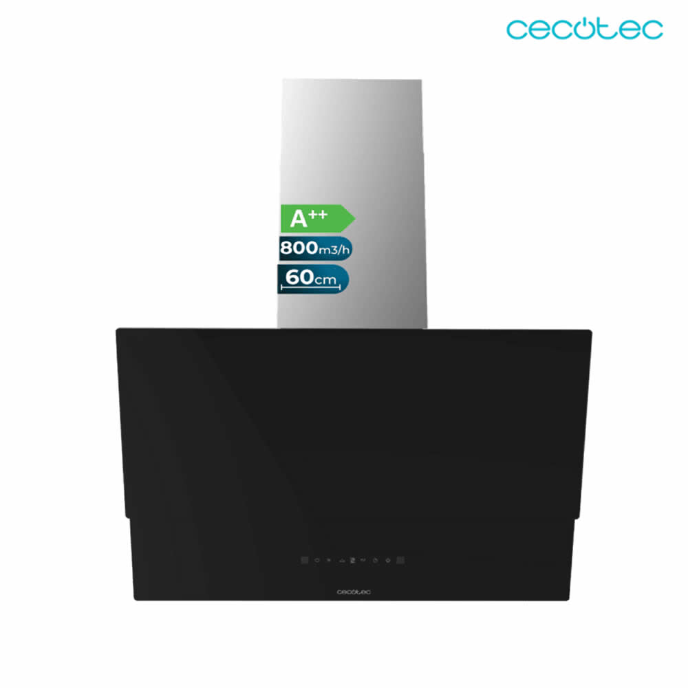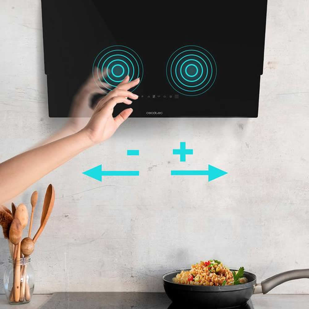 Bolero Flux DT 608001 Glass Black A++ Campana decorativa de 60cm de ancho, acabado frontal vidrio negro, chimenea inox, succión 800m3/h, Motor 210W, Clase A++, control táctil, 3 niveles de potencia, Booster, luz, filtro de carbono, Hand Movement Control y Delay Function.
