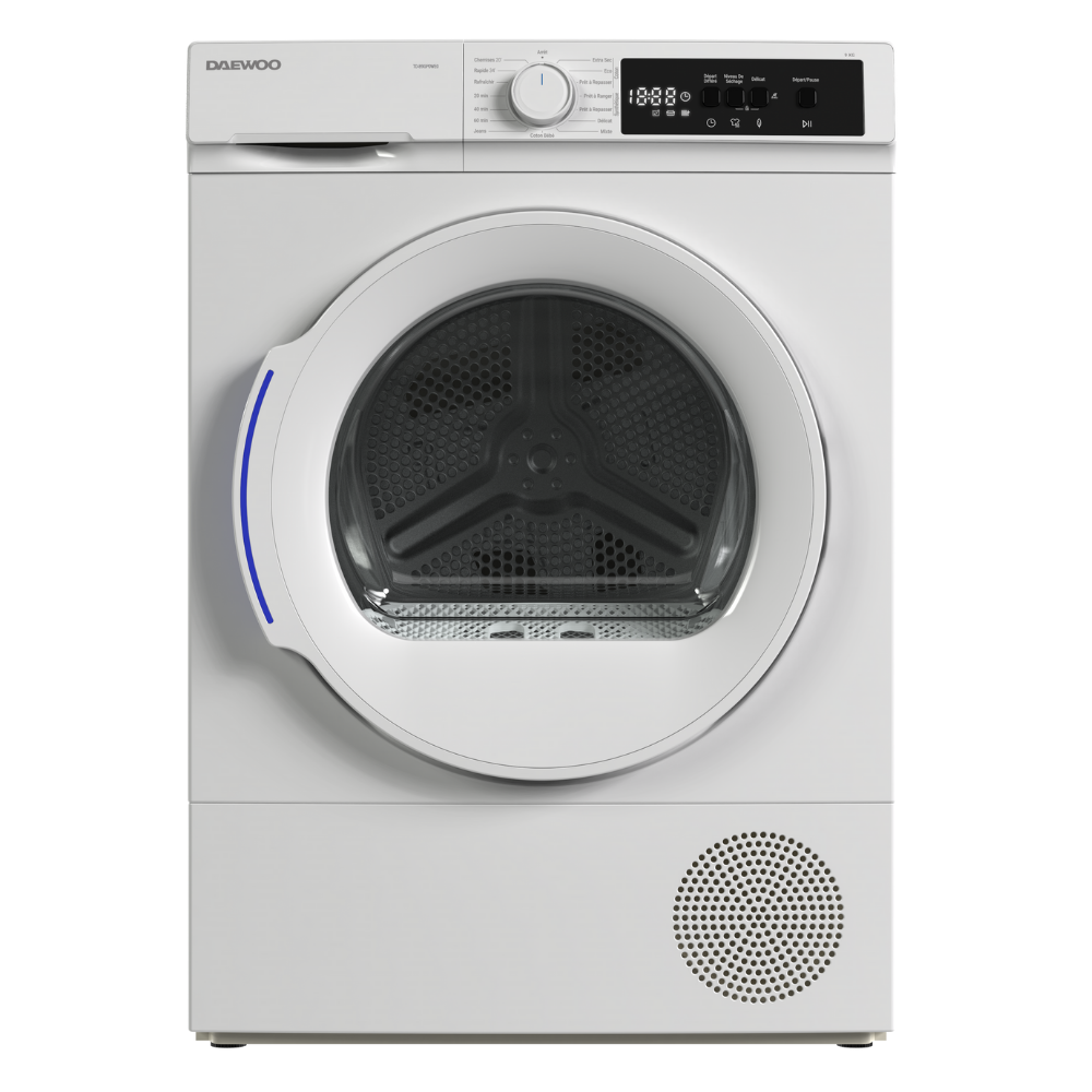 Secadora Daewoo de 9 kg con tecnología de bomba de calor, eficiente y silenciosa.